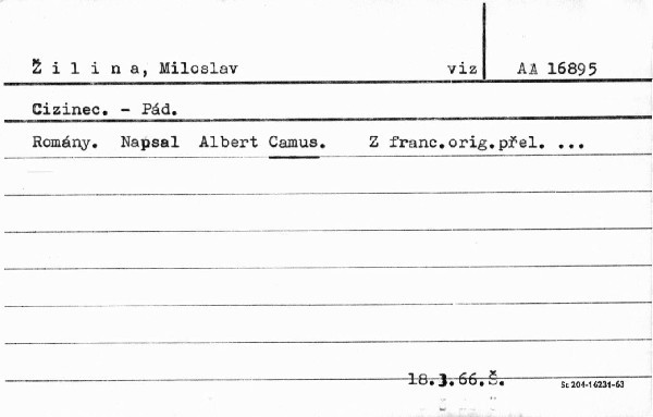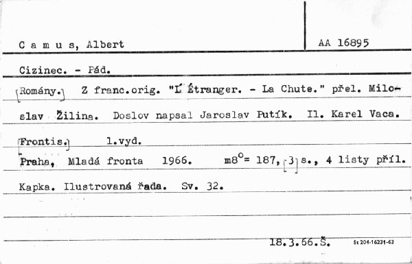 | Autor | Albert Camus ; dosl. naps. Jaroslav Putík ; ilustr. Karel Vaca ; z fr. orig. přel. Miloslav Žilina |