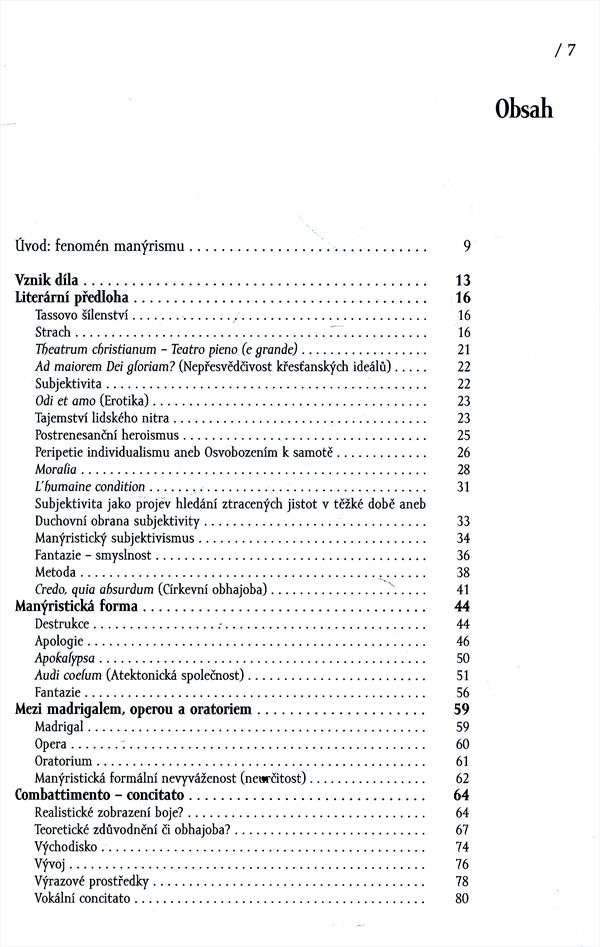 Společně s autorem můžeme velmi detailně a konkrétně nahlédnout do mnohovrstevného obrazu přechodného období v italském umění na počátku 17. století. Vybraná Monteverdiho vokální skladba Il Combattimento di Tancredi et Clorinda z roku 1624 na text renesančního eposu it. básníka Torquata Tassa se stává ohniskem, z něhož autor na základě detailní a zejména všestranné analýzy hudby a textu dovozuje řadu pozoruhodných stylových, formálních, estetických a společenských dobových jevů v italském umění a náboženství, v hudbě a v literatuře. S notovými příklady a obrazovými přílohami, rejstříky a bibliografií. Ve dvou přílohách je uvedena textová ukázka verze Monteverdiho vedle Tassova originálu Gerusalem Liberata (zpěv 12., 52-68) s českým překladem a originál textu a český překlad Monteverdiho Audi coelum.