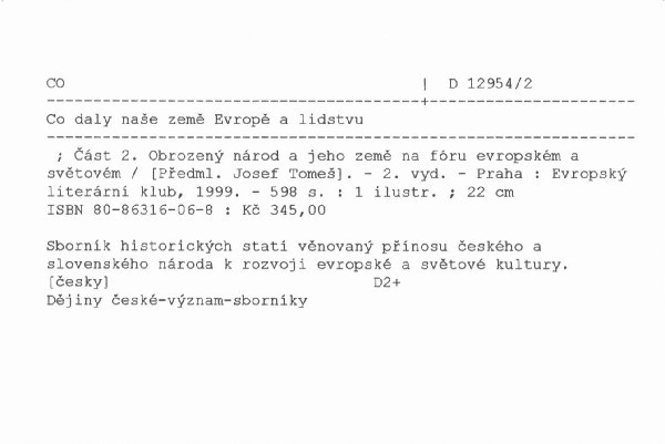 Sborník historických statí věnovaný přínosu českého a slovenského národa k rozvoji evropské a světové kultury.