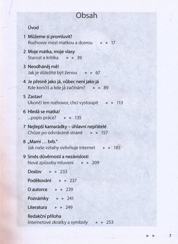Matky a dcery mají za sebou dlouhou historii – v případě dcery celý život – která obsahuje celý život rozhovorů. Mohou se smát stejným vtipům, mluvit stejným tempem a přesně vědět, co ta druhá myslí, jakmile vysloví jedno nebo dvě slova. Sdílení tohoto konverzačního vesmíru může přinášet velké potěšení. Pokud ale jiné stránky řeči té druhé lezou na nervy, obě jsou si jich také velmi dobře vědomy. Je to jako poslouchat rádio věčně naladěné na stejnou stanici, obě vědí, co přijde, když uslyší jistý druh poznámky, známý tón hlasu, určitý rytmus. Pokud jedna předpokládá, že po té poznámce, rytmu, přijde něco, co se jí nebude líbit, rozčílí se už předem. Rozhovor může být najednou velmi napjatý nebo se rovnou změní v hádku – stejnou hádku jako již mnohokrát předtím. To špatné rozhlasové drama už je obě dvě unavuje, ale nemají tu moc ani se pokusit přeladit stanici – ladicí knoflík je navždy zaseknutý. Nakladatelská anotace. Kráceno.