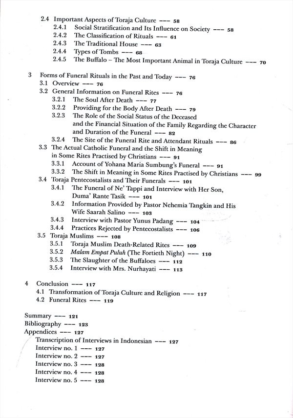 Její jádro je rozděleno do dvou kapitol - první z nich představuje etnikum Toradžů a důležité aspekty jejich kultury, druhá kapitola je založena především na výsledcích terénního výzkumu autorky. Zabývá se tím, co se stane s duší zesnulého člověka podle náboženství Aluk Todolo, jak musí pozůstalí naložit s jeho tělem a do jaké míry společenský původ ovlivňuje ještě i v současnosti typ a délku funerálního rituálu. Cílem této knihy je nastínit podobu funerálního rituálu v jeho původní formě a zachytit zásadní sociální a náboženské změny, ke kterým dochází v toradžské společnosti od počátku 20. století, kdy na jejich území vstoupili první nizozemští misionáři. Autorka knihy se snažila zjistit, do jaké míry jsou soudobé toradžské rituály synkretickým útvarem - snoubí se v nich totiž autochtonní víra Aluk Todolo a zvykové právo adat s nově přijatými náboženstvími. Práce tedy poukazuje na to, jak nově přijatá náboženství ovlivnila podobu rituálů, soustředí se zejména na jejich formální a principiální významové posuny. Nakladatelská anotace.