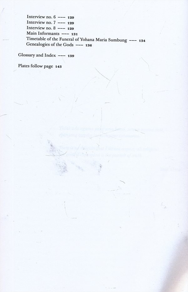 Kniha pojednává o etniku Toradžů, jež obývá provincie Tana Toraja a Toraja Utara v jižní části indonéského ostrova Sulawesi. Práce se zabývá jejich kulturou a soustředí se na nejvýznamnější soudobý toradžský rituál - pohřeb.