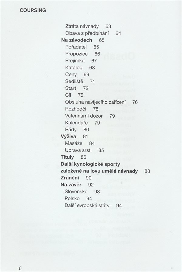 Coursing je určen zejména chrtům a příslušníkům primitivních plemen (basenji, faraónští psi, podenca), ale mohou se mu věnovat i další plemena. Příručka odpovídá na otázky, které se týkají potřebného vybavení, přípravy psa, samotných závodů či správné výživy účastníků coursingových závodů.