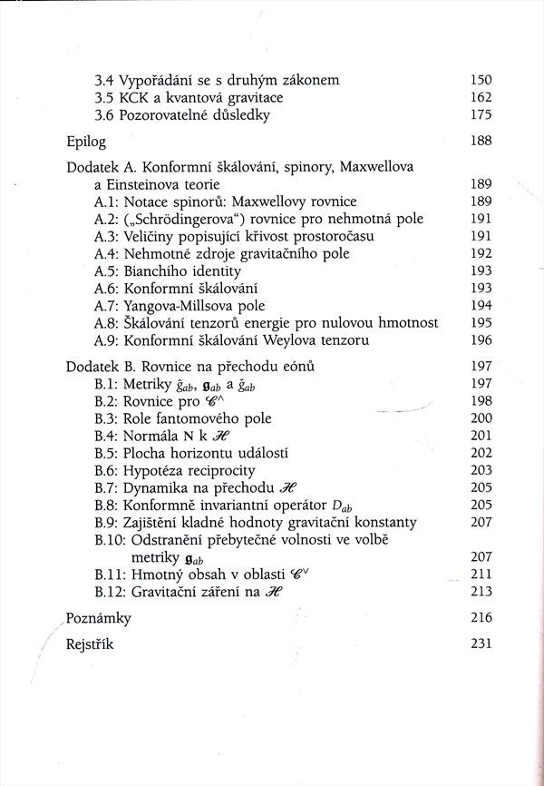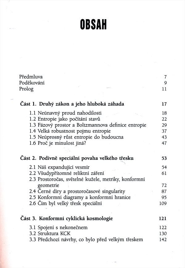 Podle Penrose zůstane jenom kauzální struktura prostoročasu, a konečné stádium vývoje našeho kosmu bude proto možné konformní transformací hladce navázat na nový velký třesk stojící na počátku následujícího eónu stále se opakujícího cyklického vesmíru. Srozumitelně napsaná kniha je určena každému, koho zajímá moderní kosmologie, především otázka zrodu vesmíru a jeho budoucího osudu. Najde v ní vysvětlení pojmu entropie, termodynamické šipky času, geometrické podstaty Einsteinovy teorie relativity, prostoročasových diagramů, zvláštní povahy velkého třesku, černých děr i jejich kvantového vypařování. Kniha obsahuje i odborněji zaměřené dodatky, v nichž Penrose uvádí rovnice obecné relativity ve spinorovém zápisu, na nichž jeho nová teorie spočívá. Nakladatelská anotace. Kráceno.