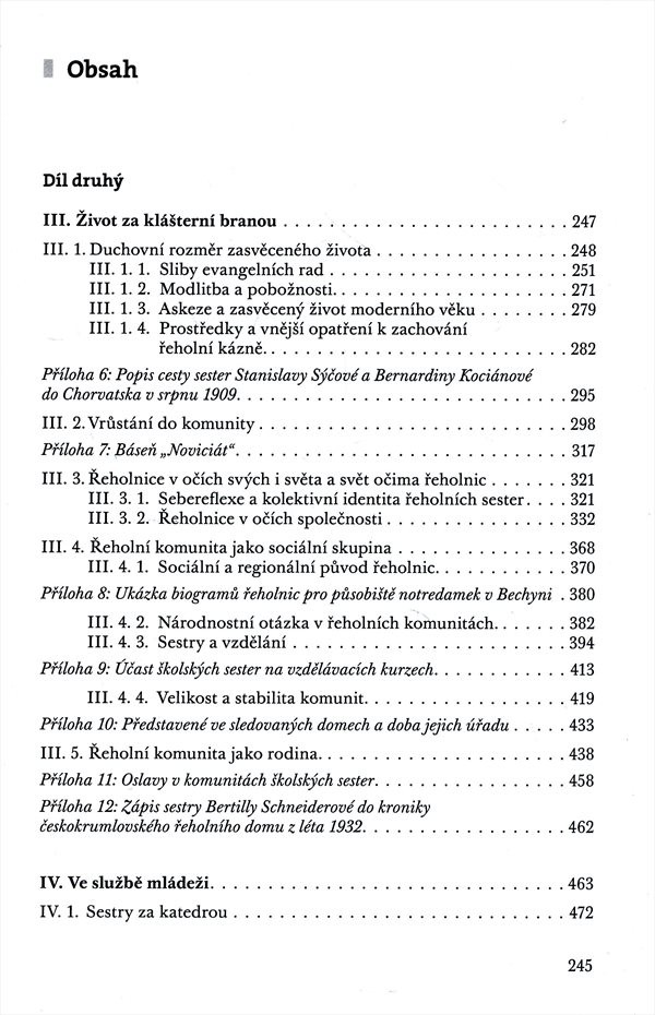 Monografie o ženských řeholních kongregacích v 19. a 1. pol. 20. stol. Druhý díl je zaměřen na klášterní život a na službu mládeži.