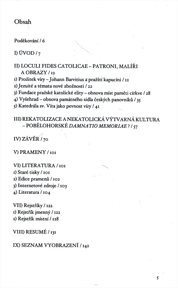5. svazek z edice Opera minora historiae artium pojednává o malířství v době předbělohorské ve spojení s katolickou církví. Autor se věnuje osobě dvorního rady J. A. Barvitia, jehož kulturní aktivity a fundace podporovaly umění v prostředí církevních řádů, zvláště kapucínů. Mezi podporované umělce patřil Paolo Piazza, který vytvořil několik obrazů pro různé pražské kostely. Jako významný donátor a mecenáš je zmíněn i císař Rudolf II., zvláště ve spojitosti např. s kostelem sv. Tomáše. Další kapitola pojednává o jezuitech a premonstrátech a získávání mecenášů pro jejich umělecké záměry např. v kostele sv. Salvátora nebo ve Strahovském klášteře. Pozornost je věnována také donátorům kostela sv. Víta. Jedna kapitola pojednává o pobělohorském odstraňování nekatolických děl a památek. Práce má dvacetistránkový poznámkový aparát, seznam pramenů a jmenný a místní rejstřík.