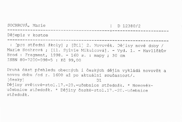 Druhá část přehledu obecných i českých dějin vykládá novověk a novou dobu /od r. 1600 až po aktuální současnost/.