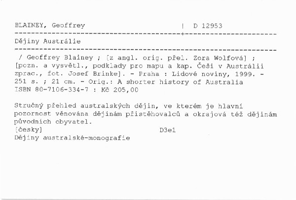 | Autor | Geoffrey Blainey ; [poznámky a vysvětlivky, podklady pro mapy a kapitolu Češi v Austrálii zpracoval, fotografie Josef Brinke] ; [z anglického originálu přeložila Zora Wolfová] |
