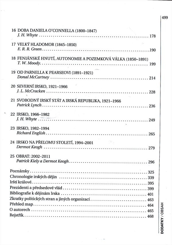 Doplněno chronologickým přehledem irských dějin, seznamem králů, prezidentů a předsedů vlád. Bibliografie. Zkratky politických stran a organizací.