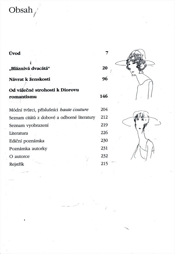 Kniha sleduje střídající se styly a zachycuje proměny v oblékání, ale i převratné společenské, politické a hospodářské události mezi dvěma válkami, které se odrazily i v prolínání módních poloh. Oděv se stává přitažlivým tématem pro nové oděvní tvůrce i umělce zastupující nové výtvarné směry (art deco, kubismus, futurismus, surrealismus, avantgardní umění, Bauhaus, lidové umění ad.). Velký vliv na módu má film a módní časopisy, módní fotografie a zejména módní salony a jejich tvůrci. Léta velké hospodářské krize a válečná léta vedou ke vzniku módy ulice a konfekce. Konec války je spojen s aktivitou módních designérů, kteří se snaží vyprovokovat zájem o krásné odívání. Prosazuje se nový vzhled (new look) výběrových kolekcí denního, pracovního, společenského a sportovního oděvu. Knihu doplňují ilustrace, seznam pramenů, slovníček pojmů a rejstřík.