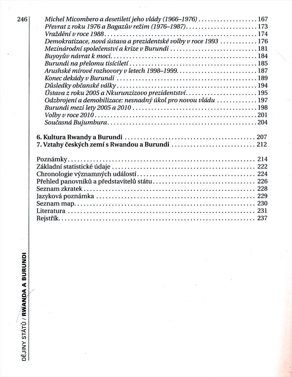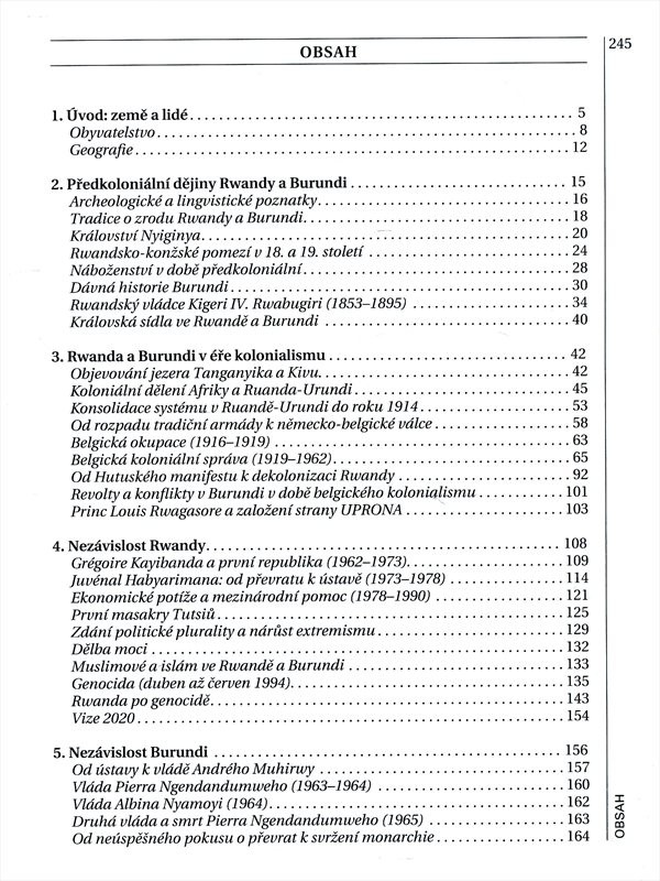 Úvodní kapitola seznamuje s geografickými podmínkami a charakterem obyvatelstva obou zemí (obyvatelstvo tvoří především kmeny Hutu a Tutsi). Následuje přehled vývoje tohoto území v jednotlivých historických etapách (předkoloniální období, období německé a belgické kolonizace, získání samostatnosti v 60. letech 20. století). V samostatných kapitolách se publikace věnuje postkoloniálnímu období ve Rwandě a v Burundi, které bylo poznamenáno tragickým vyústěním etnických konfliktů: autor popisuje genocidu ve Rwandě a občanskou válku v Burundi, jejich příčiny a následky. Závěrečné oddíly seznamují se zdejšími bohatými kulturními tradicemi a se vztahy Česka s oběma zeměmi.