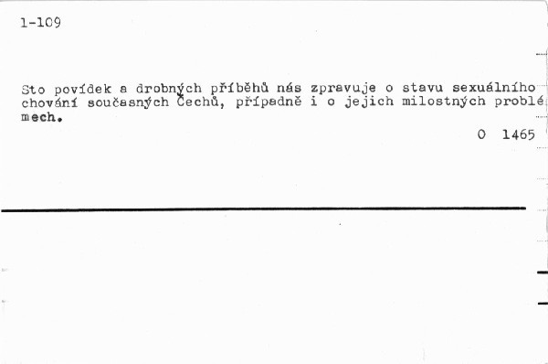 Sto povídek a drobných příběhů nás zpravuje o stavu sexuálního chování současných Čechů, případně i o jejich milostných problémech.