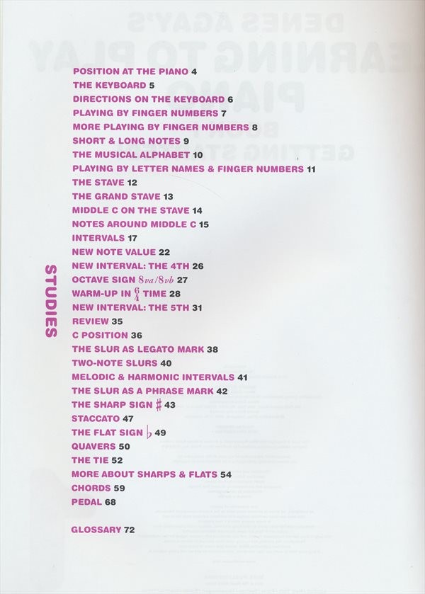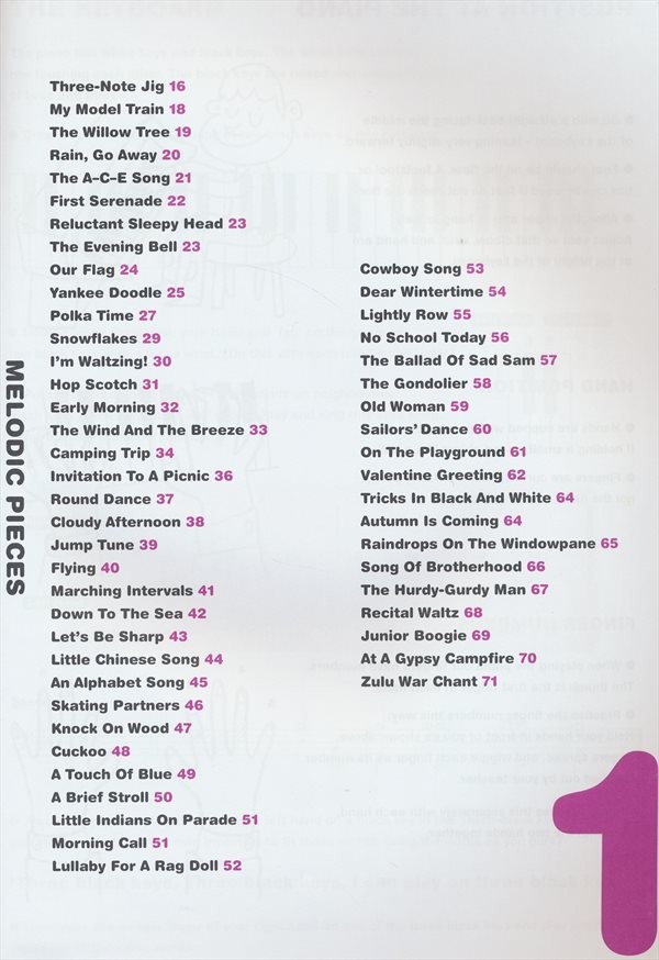 | Název dílčí části | Three-note jig --; My model train --; The willow tree --; Rain, go away --; The A-C-E song --; First serenade --; Reluctand sleepy head --; The evening bell --; Our flag --; Yankee Doodle --; Polka time --; Snowflakes --; I'm waltzing --; Hop schotch --; Early morning --; The wind and the breeze --; Camping trip --; Invitation to a picnic --; Round dance --; Cloudy afternoon --; Jump tune --; Flying --; Marching intervals --; Down to the sea --; Let's be sharp --; Little chinese song --; An alphabet song --; Skating partners --; Knock on wood --; Cuckoo --; A touch of blue --; A brief stroll --; Little Indians on parade --; Morning call --; Lullaby for a rag doll --; Cowboy song --; Dear wintertime --; Lightly row --; No school today --; The ballad of sad Sam --; The gondolier --; Old woman --; Sailor's dance --; On the playground --; Valentine greeting --; Tricks in black and white --; Autumn is coming --; Raindrops on the windowpane --; Song of brotherhood --; The hurdy-gurdy man --; Recital waltz --; Junior boogie --; At a gypsy campfire --; Zulu war chant |