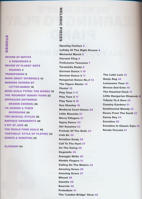 | Název dílčí části | Lullaby of the night breeze --; Memorial march --; Harvest fling --; Frolicsome twosome --; Tarantella etude --; German dance 1 --; German dance 2 --; The figure skater --; Fiesta! --; Sea chantey --; Medieval court dance --; Little mazurka --; Merry villagers --; Prelude of the bells --; Irish air --; Rotation study --; Call to the hunt --; Arpeggio waltz --; Nimble fingers --; Sailing on the waters --; Amazing grace --; The 'London bridge' strut --; The latin lark --; Lonesome tune --; Breeze and echo --; The haunted clock --; Little hungarian rhapsody --; Tribute to a hero --; Country gardens --; Danny boy --; Sonatina in classic style; Bagatelle /; Hungarian dance No. 4 /; Sonatina, op. 36 No. 1,; [op. 36, č. 1] /; Banjo rag /; Opening fanfare /; Oh! Susanna /; On the swing /; Gavotte /; Bourrée /; Gypsy dance /; Rondo-Toccata,; [op. 60 No. 4] /; Preludium /; Sentimental melody /; Roses from the south / |