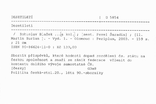 Sborník příspěvků, které hodnotí dopad rozdělení čs. státu na českou společnost a snaží se zánik federace včlenit do kontextu dalšího vývoje samostatné ČR.