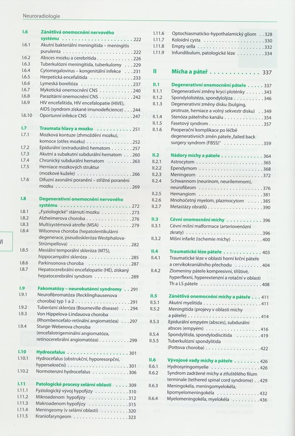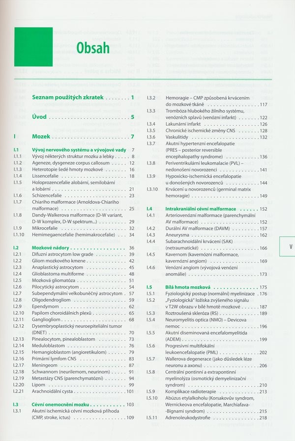 Obsahuje kromě onemocnění mozku, také patologické procesy hlavy, orbity a očního bulbu, páteře a míšních struktur. Onemocnění jsou uspořádána na základě patologicko-anatomické klasifikace. U patologické jednotky je nejprve uvedena její stručná charakteristika, nálezy na zobrazovacích metodách (především na magnetické rezonanci, dále na CT, RTG, AG, UZ, PET), dále je uveden klinický obraz a diagnostika, léčba, následuje diferenciální diagnostika, která je doplněna zobrazením. Nakladatelská anotace. Kráceno.
