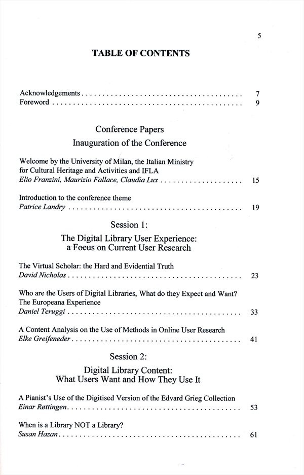 Sborník z mezinárodní konference IFLA (Mezinárodní federace knihovnických asociací a institucí) věnované digitálním knihovnám, jež se konala v Miláně roku 2009.