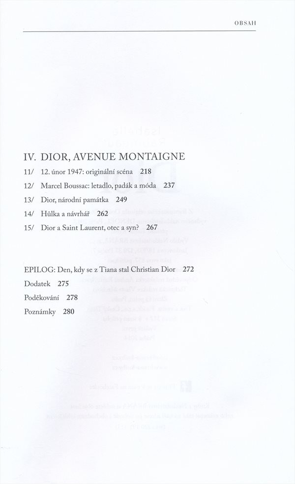 Christiana Diora, složitou osobnost plnou paradoxů, se snaží autorka prozkoumat. Od dětství tráveného ve vile na útesu na bretaňském pobřeží v Granville až po slávu na avenue Montaigne. Pomocí celé řady pohledů na všechny etapy jeho životní a profesní dráhy, které vytvářejí pravdivý obraz velikosti této skutečné "národní památky". Módního krejčího, jenž za necelé desetiletí před svou předčasnou smrtí v roce 1957 ve věku dvaapadesáti let učinil módu uměním. Nakladatelská anotace. Kráceno.