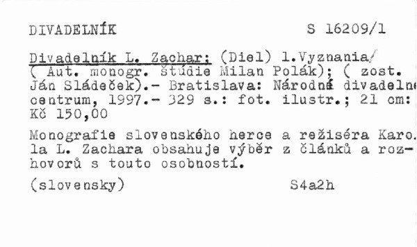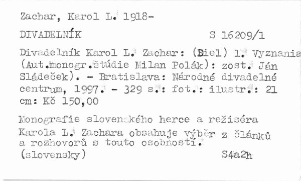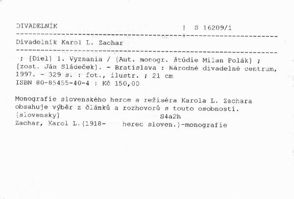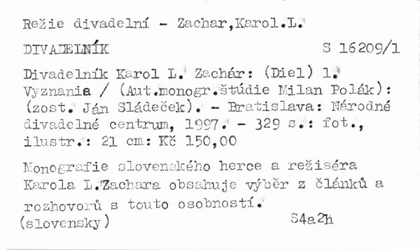 Monografie slovenského herce a režiséra Karola L. Zachara obsahuje výběr z článků a rozhovorů s touto osobností.