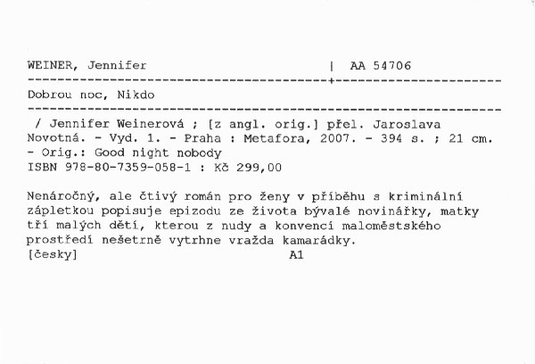 | Autor | Jennifer Weinerová ; [z angl. orig.] přel. Jaroslava Novotná |