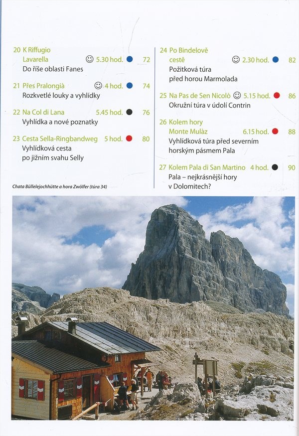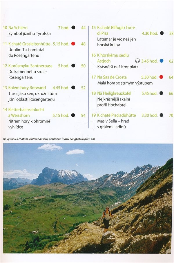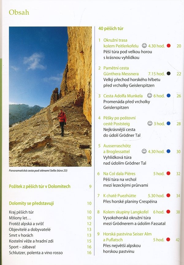 Průvodce oblastí Dolomit obsahuje 40 pěších túr, rozdělených do čtyř kategorií podle fyzické náročnosti. Doplněno mapkami a informacemi pro turisty.