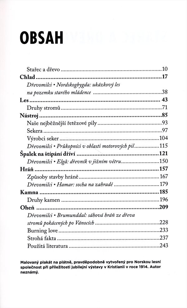 Kniha se věnuje tradici topení dřevem. Spisovatel a novinář Lars Mytting shromáždil poznatky nejen od zkušených lidí z nejchladnějších oblastí Norska, ale také od mnoha uznávaných vědců. Popisuje, na co je důležité dbát při nákupu dřeva, uvádí různé způsoby stavby hráně a zajímavé informace o schnutí dřeva a jeho spalování. Pojednává rovněž o péči o les, ekologických aspektech topení dřevem a o historii motorových pil a kamen. V neposlední řadě se v ní dočtete o osobních setkáních s lidmi, kteří mají ke dřevu zcela specifický vztah.Nakladatelská anotace.