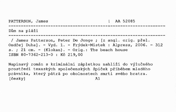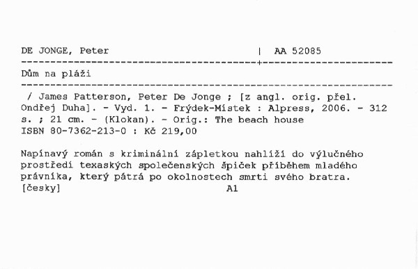 | Autor | James Patterson, Peter De Jonge ; [z angl. orig. přel. Ondřej Duha] |