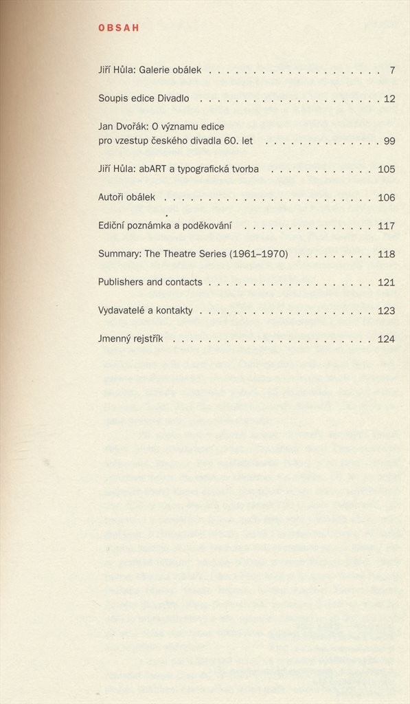 Publikace pojednává o knižní grafice (zejména o výtvarném zpracování obálek a přebalů) edice Divadlo, kterou v roce 1961 začalo vydávat nakladatelství Orbis. Obsahuje soupis titulů s ilustračními ukázkami obálek a studii o významu edice.