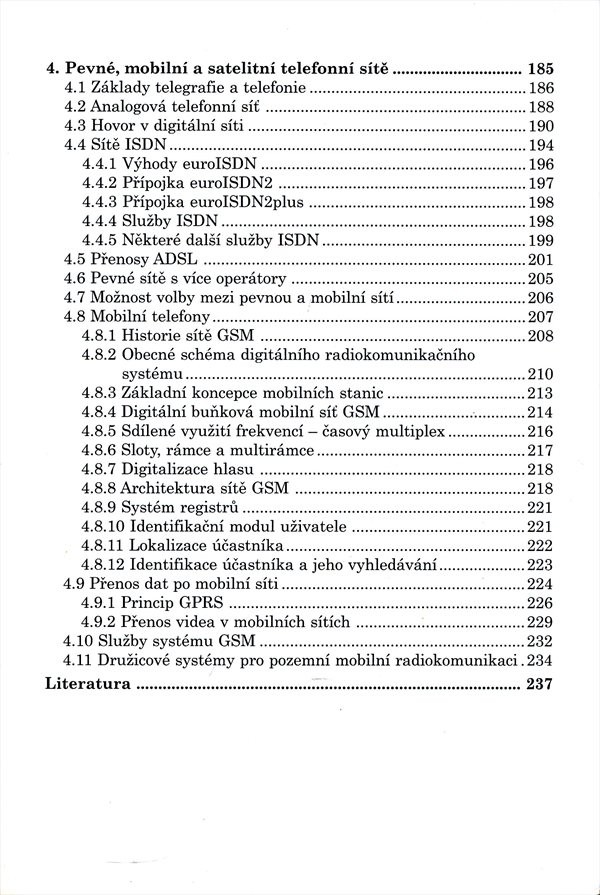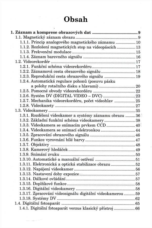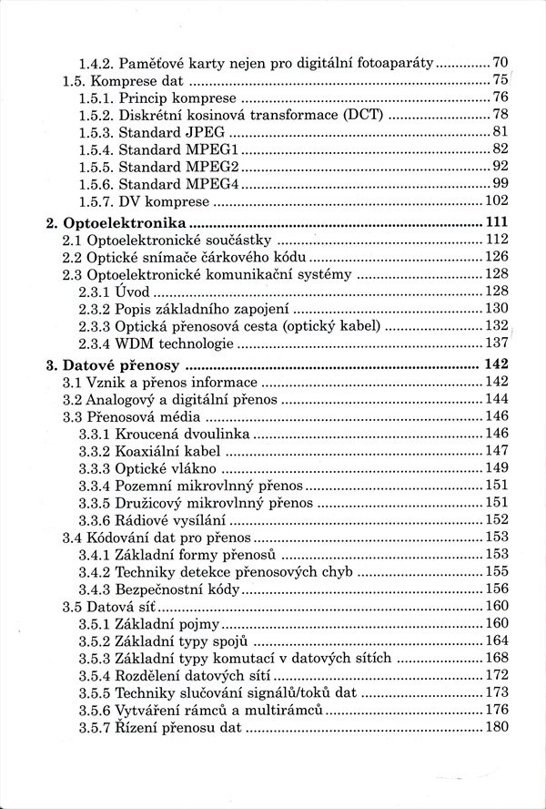 Obsah učebnice je koncipován pro potřeby učení i pro zasvěcení do problematiky vysvětlováním principů. Kniha je rozdělena do čtyř částí: první se zabývá záznamem a kompresí obrazových dat a popisuje magnetický záznam obrazu, videorekordér, digitální fotoaparát apod. Druhá část je věnována optoelektronice. Třetí kapitola se zabývá datovými přenosy (vznik a přenos informací, přenosová média, datové sítě). Poslední část popisuje pevné, mobilní a satelitní telefonní sítě. Učebnice je doplněna příslušnými nákresy a grafy a vybranou literaturou.