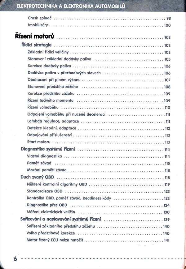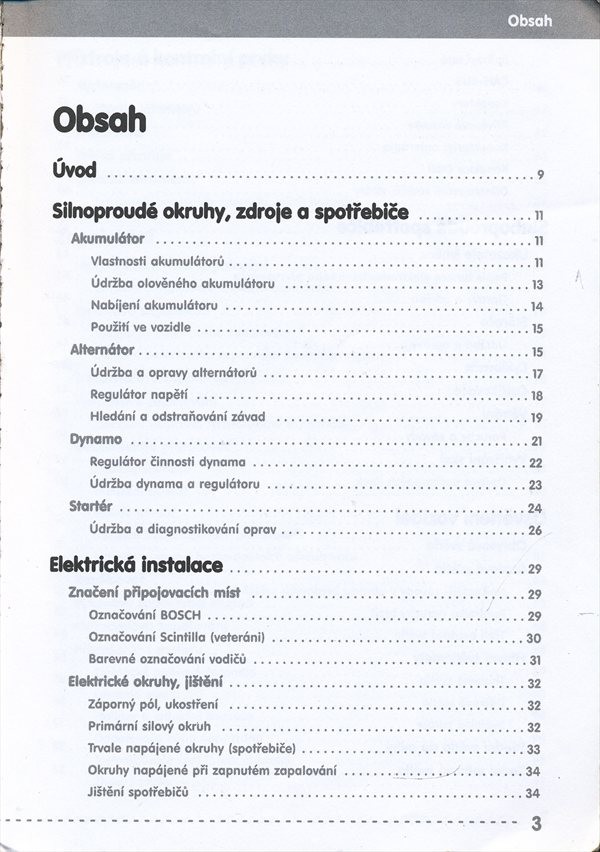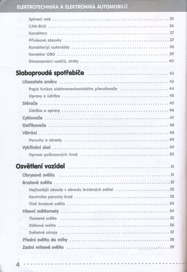 Jednotlivé kapitoly se zabývají: 1)silnoproudými okruhy, zdroji a spotřebiči (akumulátor či startér); 2)elektrickou instalací; 3)slaboproudými spotřebiči (ukazatele směru, stěrače či větrání); 4) osvětlením vozidel; 5) přístroji a kontrolními prvky (počítadlo kilometrů či otáčkoměr); 6)jednotlivými druhy zapalování; 7)řízením zážehových motorů; 8)řízením dieselových motorů a 9)systémy ovlivňujícími jízdu vozidla (protiblokovací systém ABS).