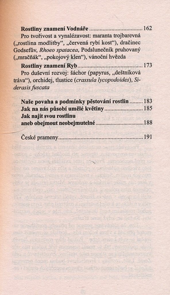 Rostliny jsou na základě působení své energie rozděleny podle dvanácti znamení zvěrokruhu, uváděny v abecedním pořadí, s černobílým ilustračním obrázkem. Tato kniha, plná hlubokého porozumění a lásky ke světu rostlin, nám květiny odhaluje jinak než jenom jako dekorativní doplněk. Nakladatelská anotace. Kráceno.