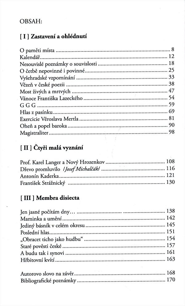 Výbor z kritik, esejů i vzpomínkových textů literárního vědce a editora. Vedle statí věnovaných méně známým osobnostem české literatury obsahuje i obecněji zaměřené úvahy (např. o krajině, čase) či komentáře ke kulturnímu dění na Valašsku.