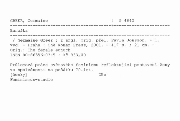 | Autor | Germaine Greer ; z angl. přel. Pavla Jonsson |