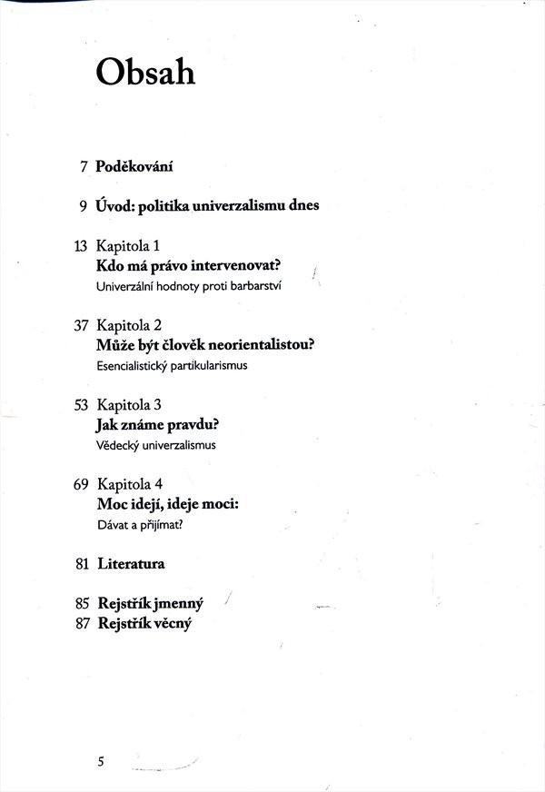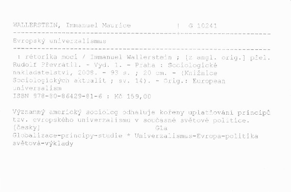 Rétorika vůdců tzv. panevropského světa, hlavních médií i intelektuálů establishmentu zdůrazňuje univerzalismus coby zdůvodnění jejich politik. Existují tři hlavní varianty daného univerzalismu: verbální zdůrazňování ochrany lidských práv, nadřazenost západní civilizace a vědecká pravdivost trhu. Wallerstein odhaluje, že témata nejsou nová, neboť představují základní rétoriku mocných přinejmenším od šestnáctého století. V podstatě se vždy diskuse točila kolem otázky, co míníme slovem univerzalismus. Univerzalismus mocných byl vždy částečným a překrouceným univerzalismem, s nímž vystupovali i nadále vystupují panevropští vůdci ve snaze prosazovat zájmy dominantních vrstev moderního světového systému. Závěr pojednává o způsobech, jak bychom mohli pokročit směrem k opravdovému univerzalismu, "univerzálnímu univerzalismu". Boj mezi evropským a univerzálním univerzalismem je ústředním ideologickým zápasem současného světa: jeho výsledek spoluurčí podobu budoucího světového systému... Ideově vlivný myslitel zkoumá mocensko-politickou podobu současného světa a nastiňuje alternativy vývoje.
