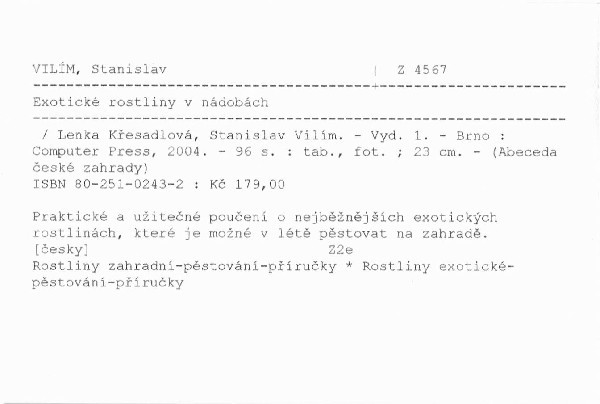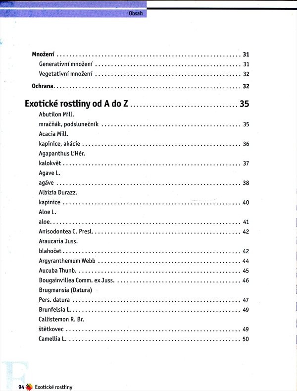 Obecné informace o exotických rostlinách, jejich původu a historii pěstování v nádobách. Podmínky pro růst, od nákupu rostliny, výběru vhodné nádoby, substrátu, zálivky, přihnojování, přesazování, řezu, množení až po přezimování. Většina textu obsahuje podrobný popis vybraných druhů rostlin včetně barevné fotografie.