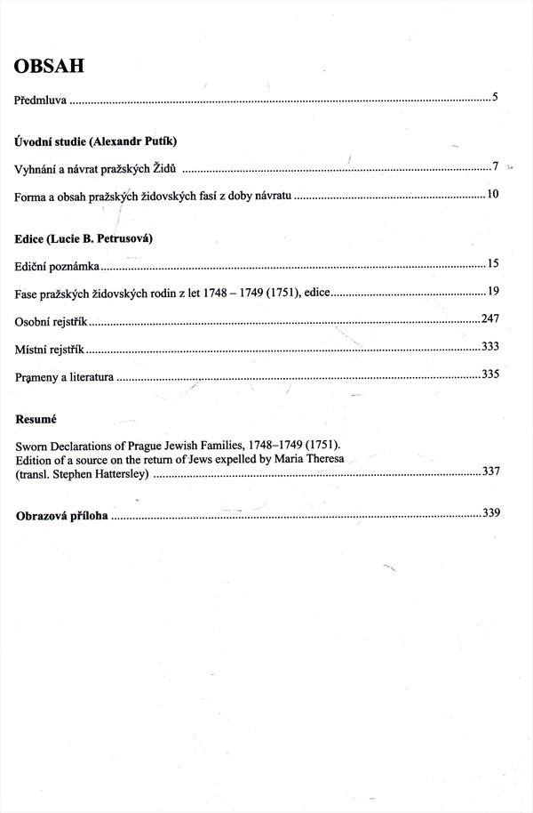 Fase (přiznání) vyplňovaly hlavy židovských rodin při návratu do Prahy po odvolání tereziánského vypovězení z let 1745-1748. Přiznání obsahovalo kromě soupisu členů rodiny a služebníků též údaje o zaměstnání hlavy rodiny, vlastnictví a umístění domu. Soubor 1473 přiznání pořízený pro evidenční potřeby židovské samosprávy fakticky nahrazuje úřední souhrnný soupis pražských Židů. Úvodní studie stručně shrnuje dějiny vypovězení i návratu a seznamuje se strukturou formuláře přiznání. Edici přiznání doplňuje osobní a místní rejstřík. Údaje obsažené v přiznáních jsou především prvořadým pramenem odborné i soukromé genealogie, umožňují však i studium různých otázek historické demografie, sociálních a hospodářských dějin i topografie. Publikace Židovského muzea v Praze představuje doplnění ediční řady soupisů židovského obyvatelstva vydávané Národním archivem. - Nakladatelská anotace.