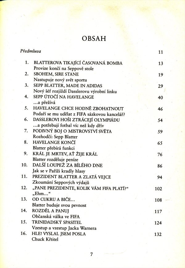 Investigativní novinář A. Jennings začíná své vyprávění volbou nového prezidenta FIFA v červnu r. 1974 před mistrovstvím světa v Německu. Sira Stanleye Rouse střídá Brazilec Joao Havelange. Již během jeho působení, ale zejména po nástupu současného prezidenta Švýcara Seppa Blaterra v r. 1998, se až příliš často objevují zprávy o zmanipulovaných hlasováních výkonného výboru FIFA, prapodivných stycích některých činovníků FIFA při prodeji velmi lukrativních marketingových a televizních práv na fotbal, tlaku významných obchodníků a výrobců sportovního vybavení na vedení FIFA. Autor se snaží alespoň poodhalit některé události a nejkřiklavější případy ze zákulisí organizace, která zaštiťuje nejrozšířenější a pro mnohé i nejkrásnější sport na zemi - fotbal ... Poznámky, dodatky, rejstřík.
