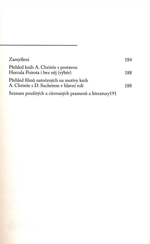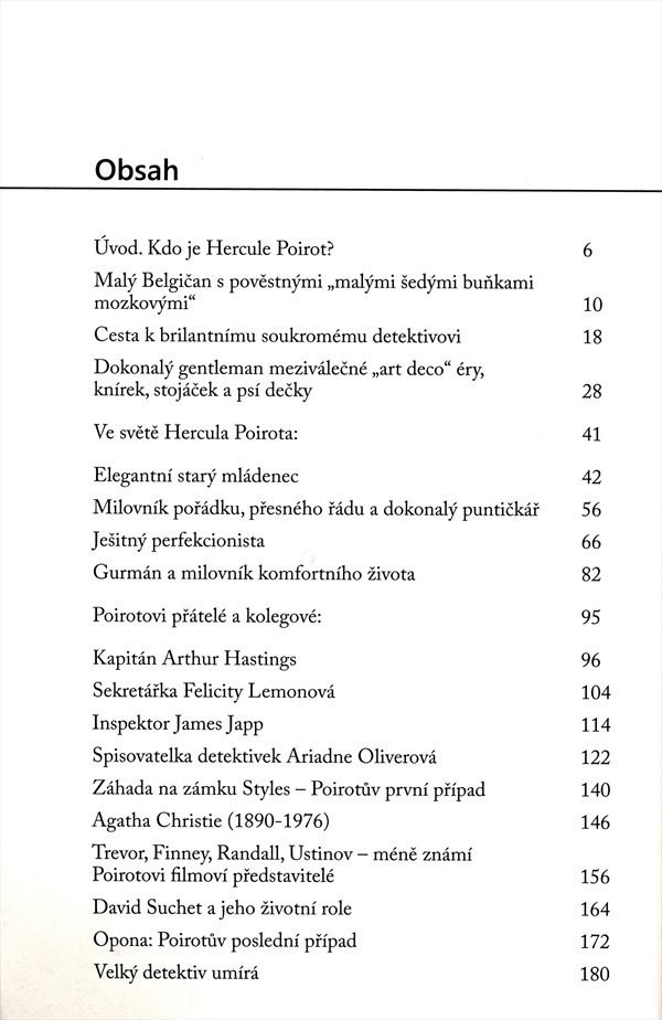 Dozvídáme se všechno možné o Poirotově zevnějšku i povaze, o vývoji jeho osobnosti, o dalších postavách, které ho v detektivkách obklopují, i o samotné Agathě Christie. Důraz je ovšem kladen spíše na filmové než na původní literární zpracování jeho příběhů, zejména na asi nejznámější ztělesnění této postavy britským hercem Davidem Suchetem. V závěru přehled knih Agathy Christie i přehled filmů s tímto hercem natočených na motivy poirotovských příběhů.