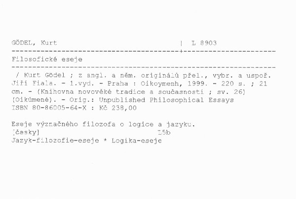 | Autor | Kurt F. Gödel* Kurt Gödel ; z angl. a něm. originálů přel., vybr. a uspoř. Jiří Fiala |