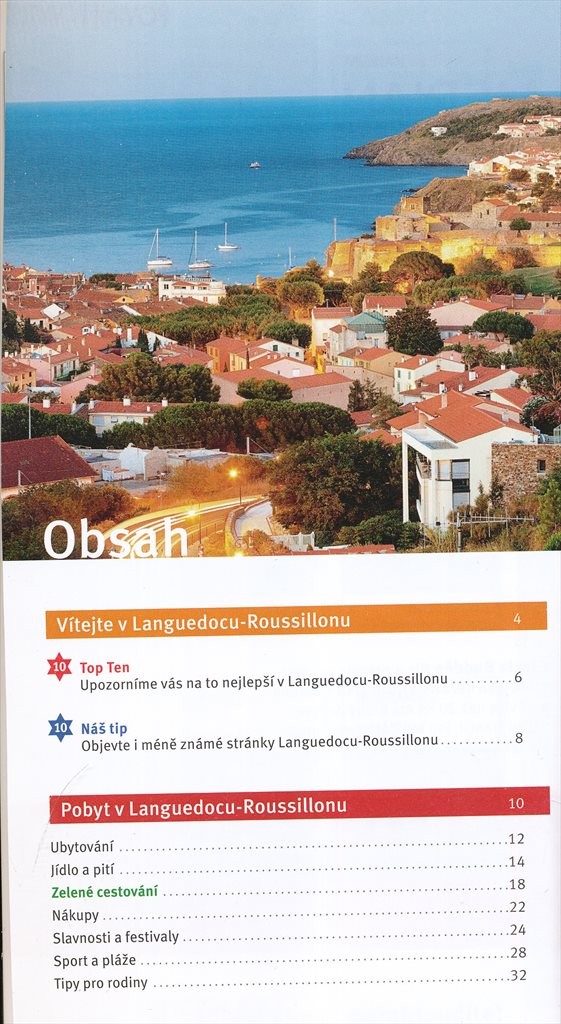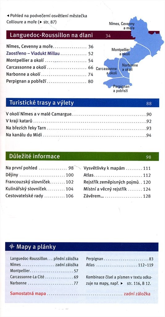 Cestovní příručka v úvodu představuje přírodu a města kraje Languedoc-Roussillon. Přináší obecné informace o kraji, radí, jak cestovat, jak se ubytovat a kde jíst. Doporučuje vhodné turistické trasy pro cesty autem, lodí nebo pěšky. Významné pamětihodnosti měst, slavnosti a trhy, muzea, restaurace, sportovní areály aj. popisuje podle abecedy včetně cílů v okolí. Průvodce dále obsahuje mapky, plánky, fotografie, stručné historické přehledy, rejstřík, slovníček, aktualizované ceny a otvírací doby.