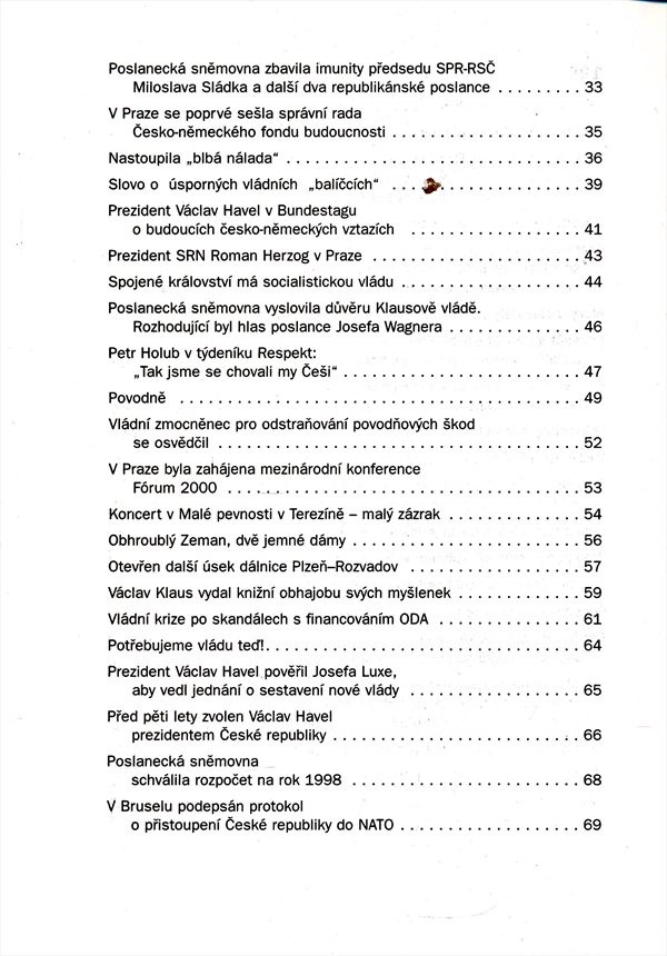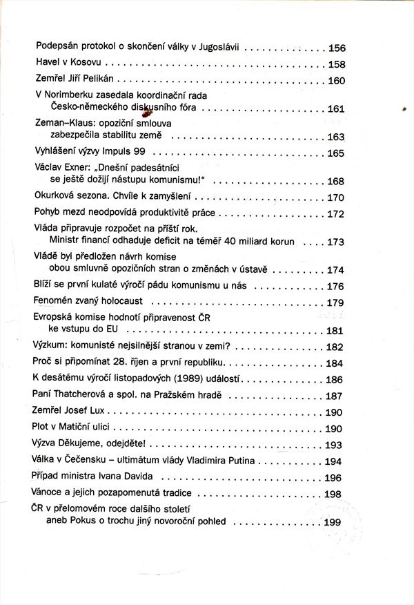 Jednotlivé glosy interpretují nejen významné (např. česko-německá deklarace, rozšíření NATO, vládní "balíčky", demise Klausovy vlády, Tošovského kabinet, opoziční smlouva, postoje ke kosovskému konfliktu) či dobově podmíněné vnitropolitické události (kupř. imunita republikánských poslanců, předvolební průzkumy, iniciativa Impuls 99, výzva Děkujeme, odejděte), ale i zahraničně politické dění (např. rusko-německé vztahy, válka v Kosovu, Čečensko). Knižní vydání pravidelných komentářů pro Český rozhlas 1 - Radiožurnál.