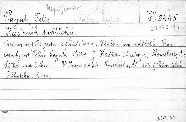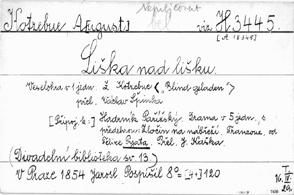 Autor | francouzsky od Felixe Pyata ; přeložil J. Kaška. Liška nad lišku : veselohra v jednom jednání / z Kotzebue ("Blind geladen") ; přeložil Václav Špinka |
