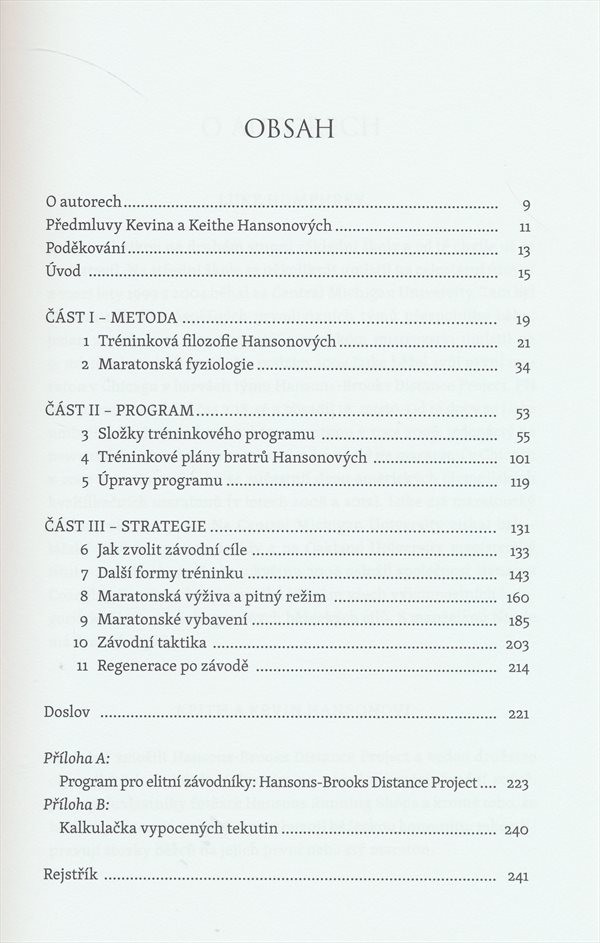 Autory příručky Hansonova metoda maratonu jsou Kevin a Keith Hansonovi. Sourozenci přicházejí s konceptem, který vyžaduje disciplínu. Většina hobíků prý běhá podle toho, jak by chtěli, a ne podle toho, jak by měli. Jinými slovy: když se budeme řídit sami sebou, jsme na nejlepší cestě se příštím maratonem protrpět a další pro jistotu nezkoušet. Návodů, jak zaběhnout maraton co nejrychleji s přípravou dvakrát či třikrát týdně, jsou na trhu spousty. Určitě se někde skrývá i "vědecky" podložená úvaha o tom, že se to dá zvládnout i s jednodenním tréninkem. Hansonovi přicházejí s něčím totálně nemoderním, neinstantním a zdlouhavým: běhejte šest dní v týdnu. Nežeňte se, nepřehánějte dlouhé víkendové výběhy, nepřekračujte 30 % součtu kilometrů uběhnutých přes týden. Jen tak přivyknete únavě, jen tak vás maraton nezdecimuje. Nakladatelská anotace. Kráceno.