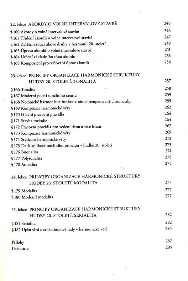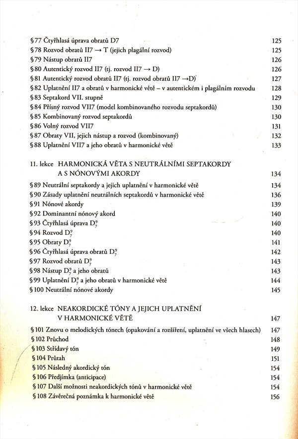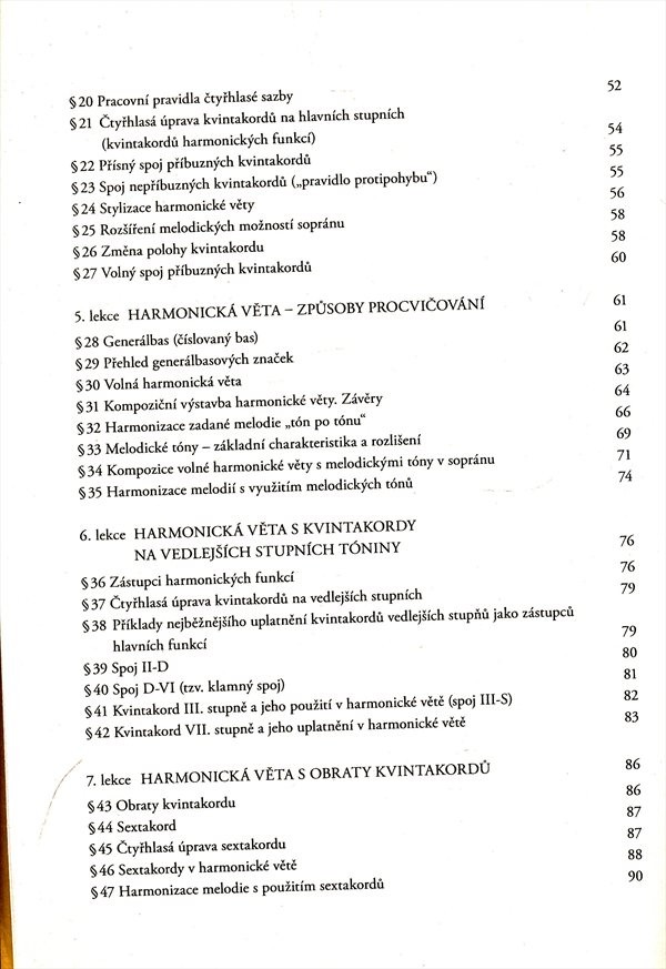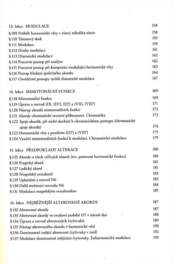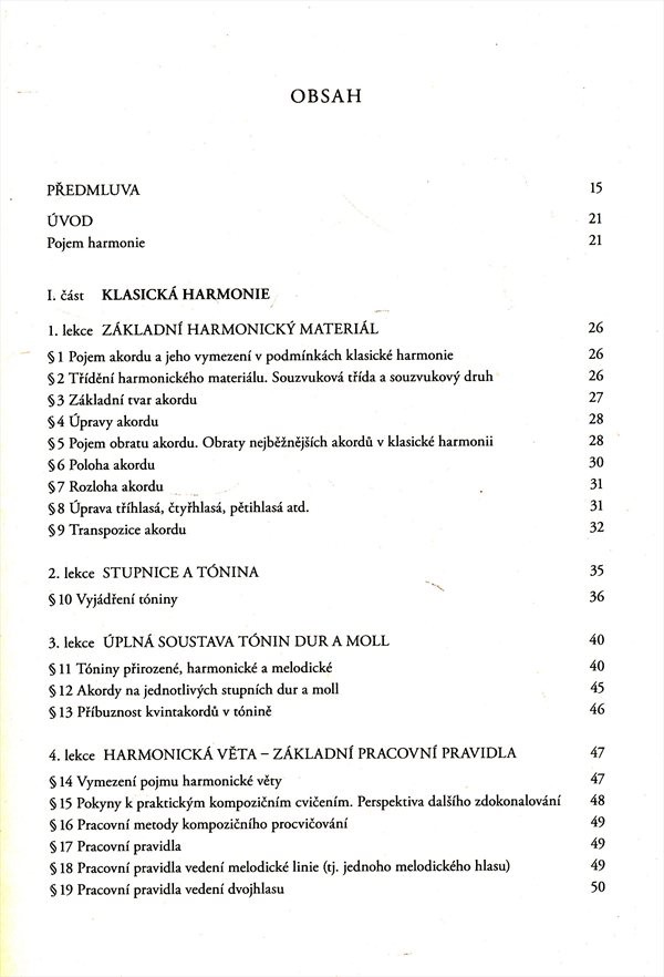 Nejde o klasickou učebnicí harmonie a tato kniha rozhodně není určena samoukům. Je míněna spíše jako přehled učiva, který zahrnuje klasickou harmonii i harmonii 20. století. Učivo je rozděleno do 25 lekcí, z nichž každá lekce přináší systematický výklad určitého okruhu problémů a k němu pak úlohy k procvičování. V úvodu knihy sám autor doporučuje a radí, jak pracovat s textem učebnice. V závěru uvádí nezbytný seznam literatury, z kterého je možno při dalším studiu čerpat.