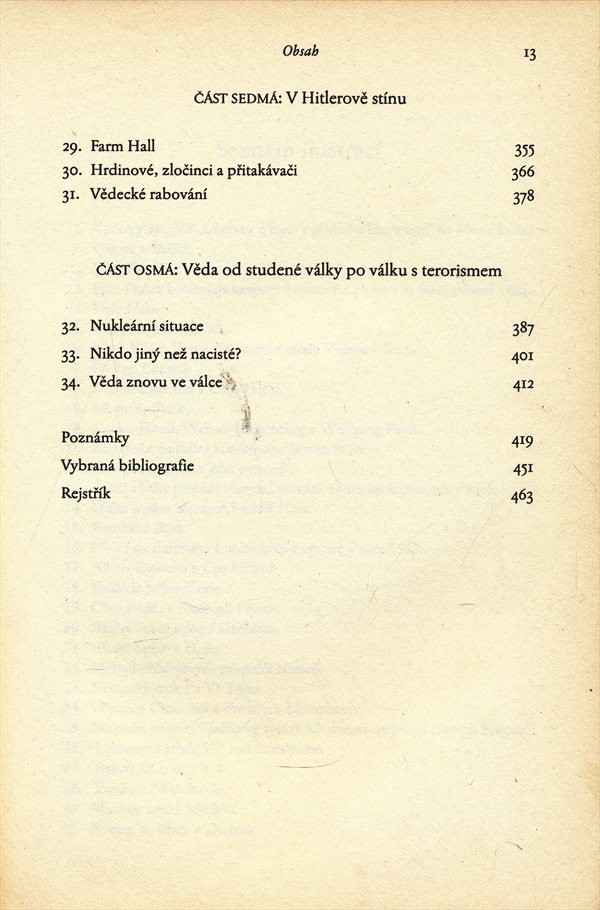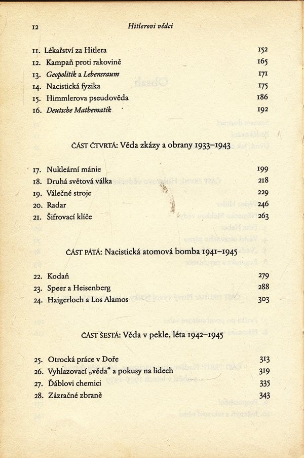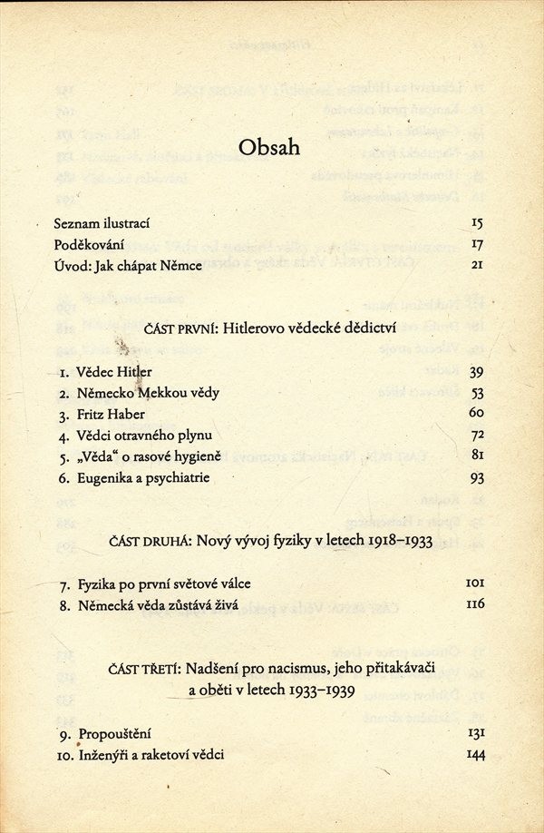 Na sklonku 19. a počátku 20. století patřila německá věda a technika v mnoha odvětvích ke světovým špičkám. Vynikající úroveň průmyslových výrobků, výsledky německé elektrotechniky, chemie, optiky, přesného strojírenství i dalších oborů udivovaly svět. Vzkvétaly univerzity i štědře dotovaná výzkumná střediska a průmyslové laboratoře. Poválečná výmarská republika je ještě svědkem nebývalého rozmachu fyziky, ale po nástupu Hitlera v r. 1933 se situace ve vědeckých kruzích zásadně mění. Mnoho vědců (často židovského původu) odchází do ciziny, většina se však podrobuje nacistické ideologii a prostředí totalitního režimu. Velmi poutavé vyprávění nás zavede mezi německé špičkové inženýry a raketové vědce, chemiky, lékaře, psychiatry a další, kteří své nadání dali k službám třetí říši. Vnímavý čtenář možná najde i odpověď na otázku míry, hranice loajality vědců ke společnosti. Těžištěm jsou sice 30. a 40. léta minulého století, ale kniha má mnohem širší záběr a nabízí zajímavý, byť stručný pohled na vědu, vědecké prostředí v Německu v celé 1. polovině 20. století. Fotografie, poznámky, seznam literatury.