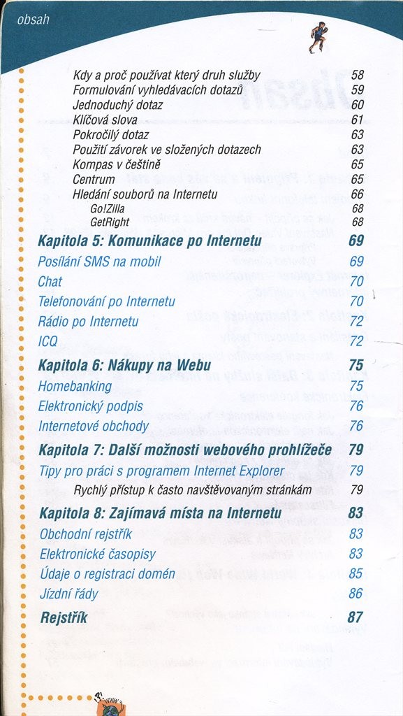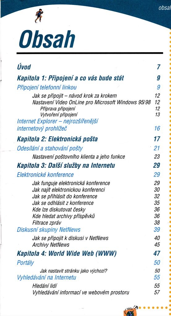 Publikace je rozdělena do osmi kapitol. Prvá seznamuje uživatele s tím, jak se telefonicky připojit k Internetu. Další části jsou věnovány elektronické poště, elektronické konferenci a zásadám vyhledávání v portálech. Závěr knihy se zabývá chatováním, posíláním SMS na mobil, homebankingem, elektronickým podpisem i obchodem na webu a přináší zajímavé webovské adresy. Brožura je provázena barevnými obrázky a doplněna předmětovým rejstříkem.