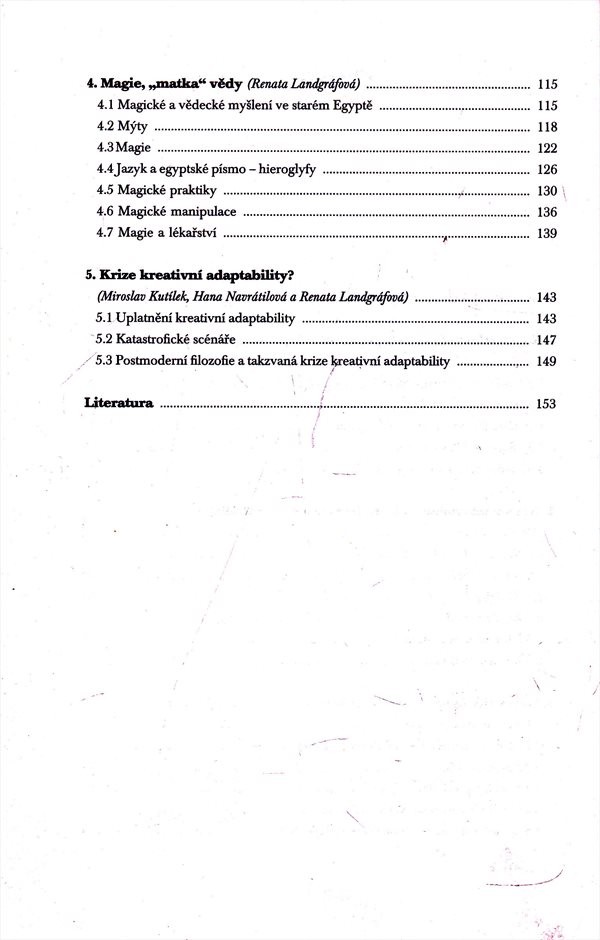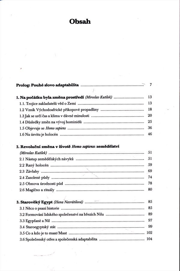 Lidská schopnost adaptovat se na změny prostředí se proměňovala od prvotního pouhého pasivního přizpůsobování se přes zvýšený podíl aktivity u druhů Homo až k tvůrčí adaptabilitě, kterou nalézáme u Homo sapiens. Značná pozornost je věnována zásadní revoluci v dějinách lidstva, tedy vzniku a rozvoji zemědělství, a jejím důsledkům, které vedly k nové strukturalizaci lidské společnosti. Tvůrčí adaptabilita je pak podrobně popsána na příkladu rozvoje egyptské kultury. Autoři však nezastírají možné negativní stránky civilizačního rozvoje a poskytují nové pohledy na překonávání těchto potíží a na zrod a vývoj věd. Nakladatelská anotace. Kráceno.
