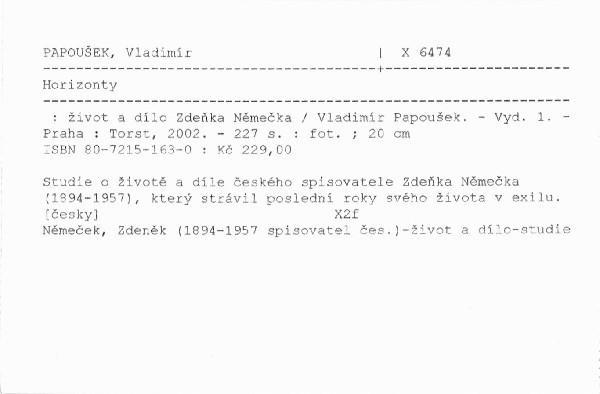 Studie o životě a díle českého spisovatele Zdeňka Němečka (1894-1957), který strávil poslední roky svého života v exilu.