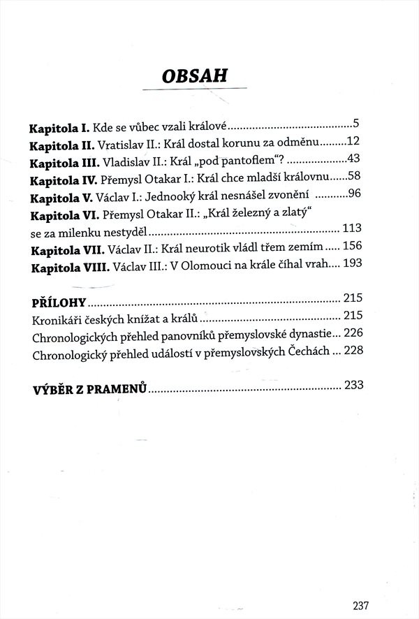 Portréty českých králů (Vratislava II., Vladislava II., Přemysla Otakara I. Václava I., Přemysla Otakara II., Václava II. a Václava III.) popisují jejich politické činy v souvislosti s historickým vývojem našich zemí od 11. do počátku 14. století, nevyhýbají se ani temným stránkám jejich povah nebo milostnému životu. Přílohy, chronologický přehled důležitých událostí.