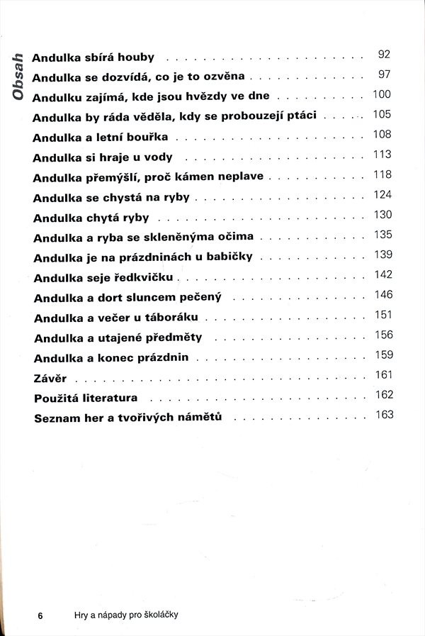 Příručka pro učitele i rodiče volně navazuje na předchozí autorčiny publikace z řady Hry a nápady pro školáčky. Andulka, hlavní postavička knihy, provází čtenáře letním obdobím a nabízí náměty na nejrůznější činnosti pro poslední dny školního roku a hlavně pro období letních prázdnin. Kniha obsahuje hry a úkoly do letní přírody i na doma, výtvarné inspirace a také vyprávění a hádanky. Jednotlivé náměty jsou zaměřeny na rozvoj výtvarných, jazykových, grafomotorických a pozorovacích schopností dětí. Najdeme zde kresebné předlohy pro jednoduché malování a podrobné pracovní návody. Rodiče, učitelé, ale i samy děti jistě uvítají tuto inspiraci pro volný čas.